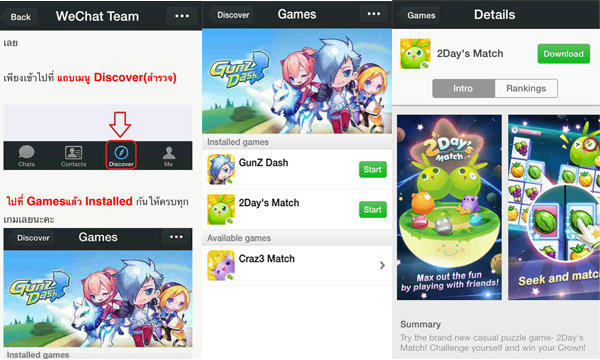 ก่อนอื่นเราต้องโหลดเกมส์มาก่อนครับ ขอบอกว่าเป็นเกมส์ฟรีนะจ๊ะมันส์ได้ไม่ต้องเสียเงิน ก่อนอื่นนั้นเราต้องทำการโหลดแอพพลิเคชั่น WeChat มาใช้งานก่อน หลังจากนั้นก็ให้ไปที่แถบเมนู Discover (สามารถทำตามภาพที่ทางทีมงานแสดงประกอบด้านล่างได้เลยครับ)