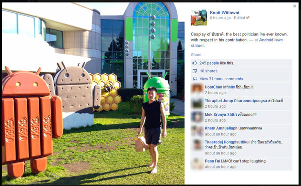 โดยภาพของ คุณ Knott Wittawat นั้นได้ถ่ายที่สวนประติมากรรม Android lawn statues สนามหญ้าที่มีปั้นพลาสติกขนาดใหญ่ของ Android ตั้งอยู่ด้านหน้าของอาคาร 44 ใน Googleplex (สำนักงานใหญ่ของ Google) ไกลถึงแคลิฟอร์เนียเลยครับ