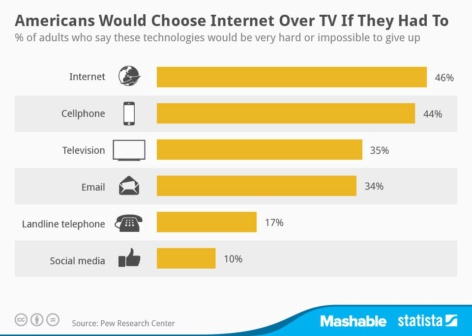 ตามผลสำรวจล่าสุดของ Pew Research เปิดเผยว่า สำหรับอเมริกันชนแล้ว “อินเตอร์เน็ท” เป็นเทคโนโลยีที่ยากจะหักห้ามใจให้ไม่เล่นมากที่สุด ในขณะที่อันดับสองคือโทรศัพท์มือถือ และอันดับสามคือโทรทัศน์ ในขณะที่เมื่อหลายปีก่อนหน้านี้ ผลสำรวจออกมาว่าชาวอเมริกันยอมที่จะไม่เล่นอินเตอร์เน็ทมากกว่าที่จะอดดู โทรทัศน์