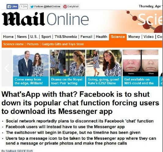สำนักข่าวเดลี่ เมล์ รายงานว่า เฟซบุ๊คได้เตรียมเลิกให้บริการแชทของแอพพลิเคชั่นยอดนิยม"WhatsApp"แก่ผู้คนทั่วโลกแล้ว โดยจะให้ผู้คนหันมาใช้แชท"Messenger"ของเฟซบุ๊คแทน