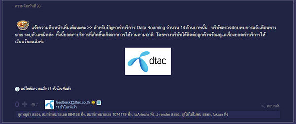โดยทางตัวแทนจาก ดีแทค ได้เผยผ่านเว็บไซต์พันทิปว่า "สำหรับปัญหาค่า บริการ Data Roaming จำนวน 14 ล้านบาทนั้น บริษัทตรวจสอบพบการแจ้งเตือนทาง sms ระบุตัวเลขผิดค่ะ ทั้งนี้ยอดค่าบริการที่เกิดขึ้นเกิดจากการใช้งานตามปกติ โดยทางบริษัทได้ติดต่อลูกค้าพร้อมดูแลเรื่องยอดค่าบริการให้เรียบร้อยแล้ว ค่ะ" สรุปว่า ปัญหาเงินค่าโรมมิ่ง 14 ล้านบาทนั้น ได้คลี่คลายลงเรียบร้อยแล้วครับ