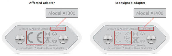 สำหรับท่านที่อยากทราบว่า Adapter ที่ใช้อยู่ เข้าข่ายหรือไม่ ให้ตรวจสอบตรงตัวหนังสือ CE จะเป็นสีเทาเข้ม และมีการระบุโมเดลว่า Model A1300 ถ้าพบว่า Adapter ที่ใช้อยู่ มีลักษณะตามนี้ ให้นำไปเปลี่ยนที่ร้าน แอปเปิล ได้เลย ซึ่งเปลี่ยนได้ฟรีครับ ส่วน Adapter ตัวใหม่ที่ได้มา ตัวอักษร CE จะเป็นสีขาว และเปลี่ยนเป็นโมเดล Model A1400 แทน