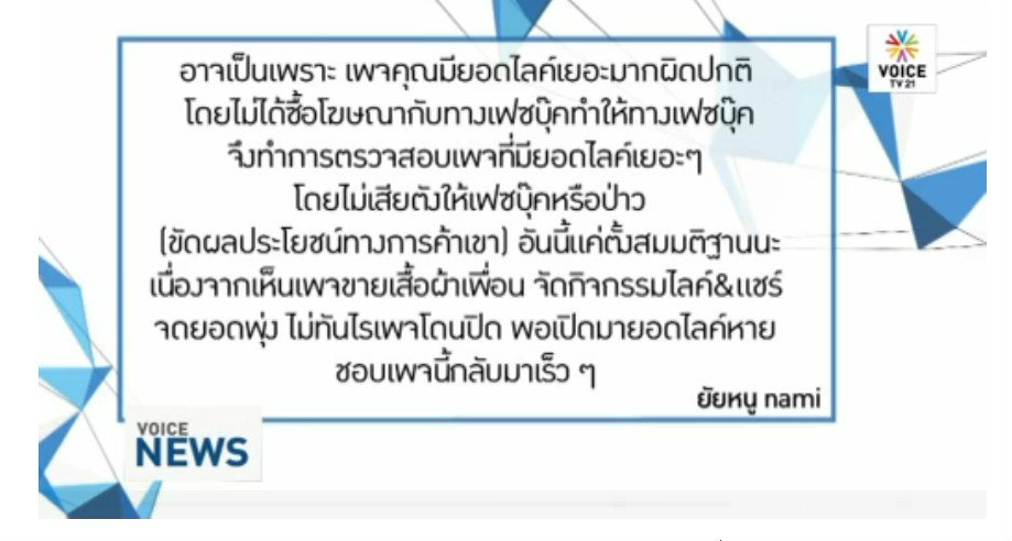 อาจเป็นเพราะ เพจคุณมียอดไลค์เยอะมากผิดปกติ โดยไม่ได้ซื้อโฆษณากับทางเฟซบุ๊ก ทำให้ทางเฟซบุ๊กจึงทำการตรวจสอบเพจที่มียอดไลค์เยอะๆ โดยไม่เสียตังให้เฟซบุ๊กหรือป่าว (ขัดผลประโยชน์ทางการค้าเขา)อันนี้แค่ตั้งสมมติฐานนะ เนื่องจากเห็นเพจขายเสื้อผ้าเพื่อน จัดกิจกรรมไลค์&แชร์ จนยอดพุ่ง ไม่ทันไรเพจโดนปิด พอเปิดมายอดไลค์หาย ชอบเพจนี้กลับมาเร็วๆ